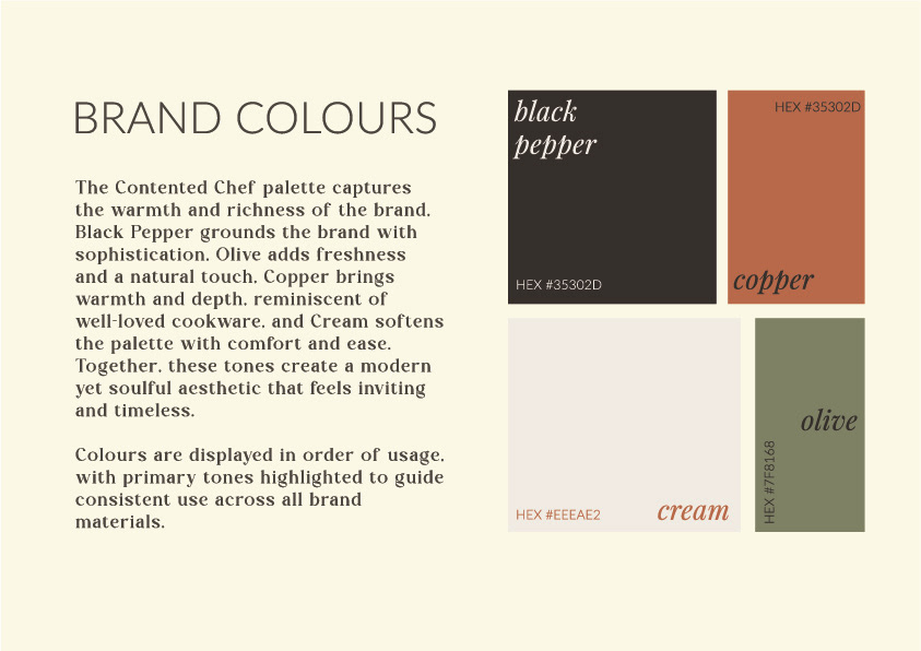 For The Contended Chef, I developed a modern, elevated brand identity for a food focused platform celebrating family-inspired recipes, catering & dinner parties, and soul food. The logo combines classic serif typography with a hand drawn star anise icon, a subtle nod to the founder's heritage, reflecting the warmth and sophistication of the brand.